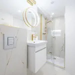 1-slaapkamer Elegant Studio - Entresol, Balcony - By Rentujemy Appartement heeft een balkon, voorzien van een bank en moderne gemakken zoals een flatscreen TV met satellietzenders. 1 badkamer met een apart toilet en een douche samen met een haardroger en badlakens wordt aangeboden.